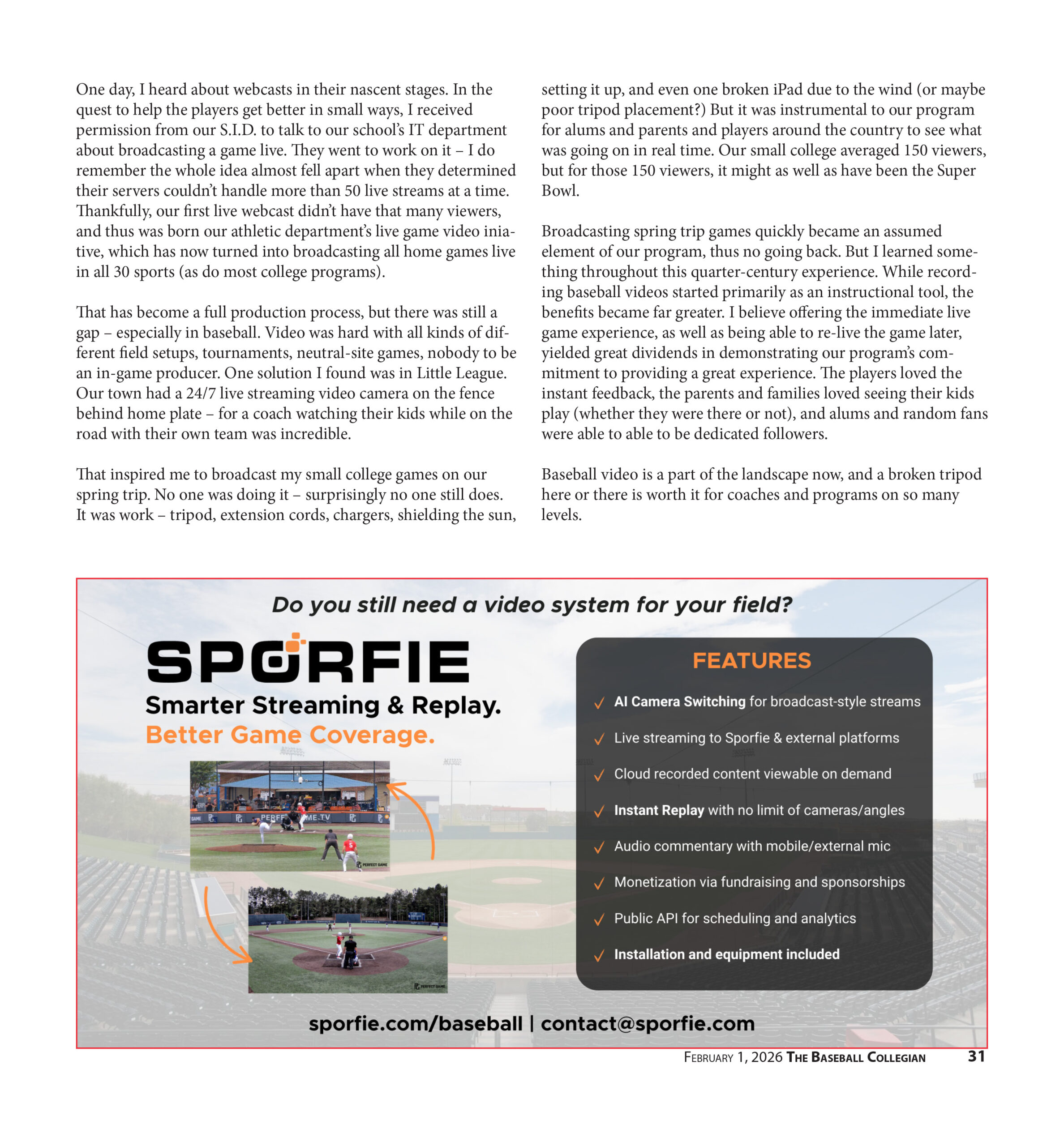 That inspired me to broadcast my small college games on our spring trip. No one was doing it – surprisingly no one still does. It was work – tripod, extension cords, chargers, shielding the sun, setting it up, and even one broken iPad due to the wind (or maybe poor tripod placement?) But it was instrumental to our program for alums and parents and players around the country to see what was going on in real time. Our small college averaged 150 viewers, but for those 150 viewers, it might as well as have been the Super Bowl.