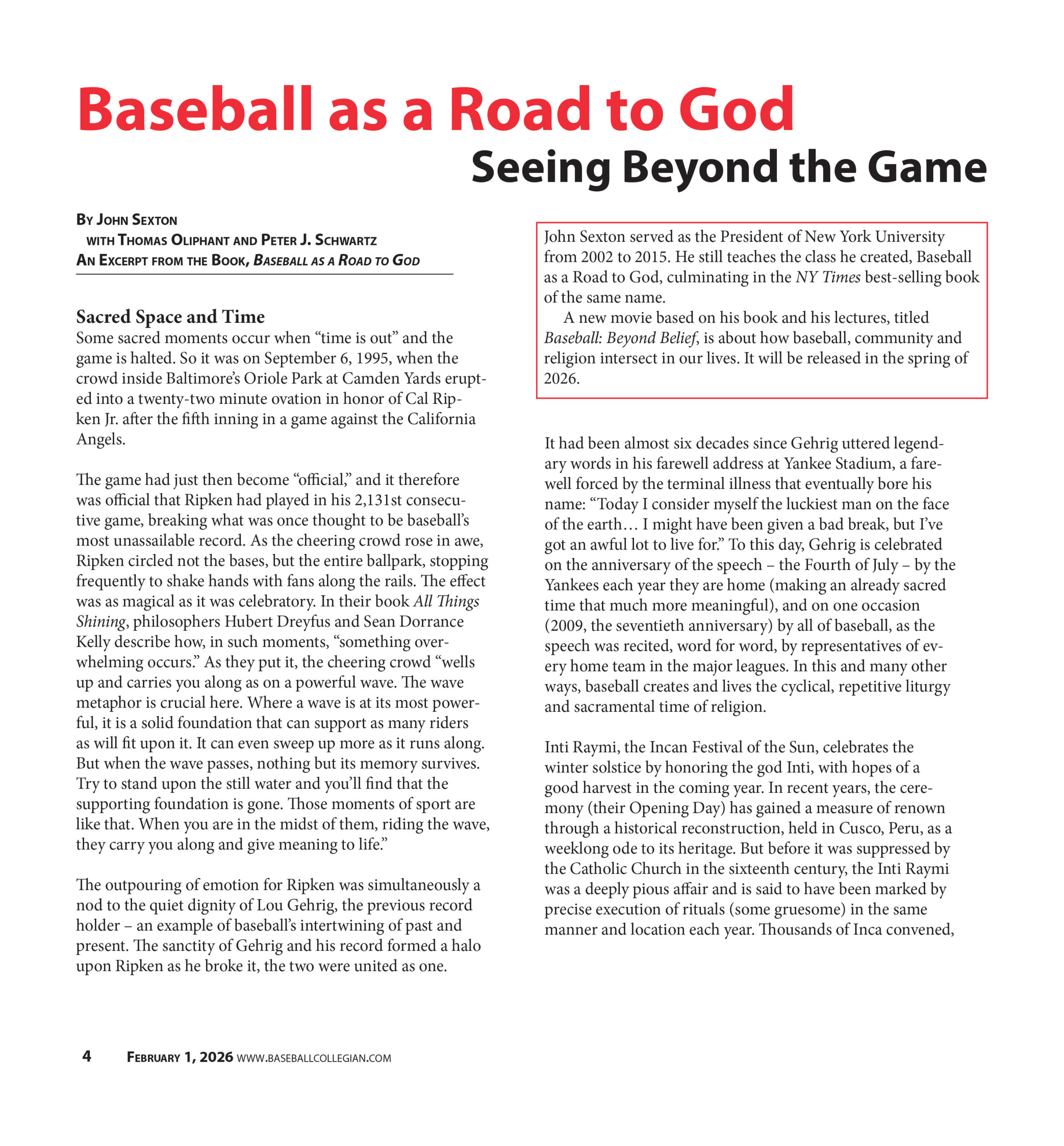A new movie based on his book and his lectures, titled Baseball: Beyond Belief, is about how baseball, community and religion intersect in our lives. It will be released in the spring of 2026.