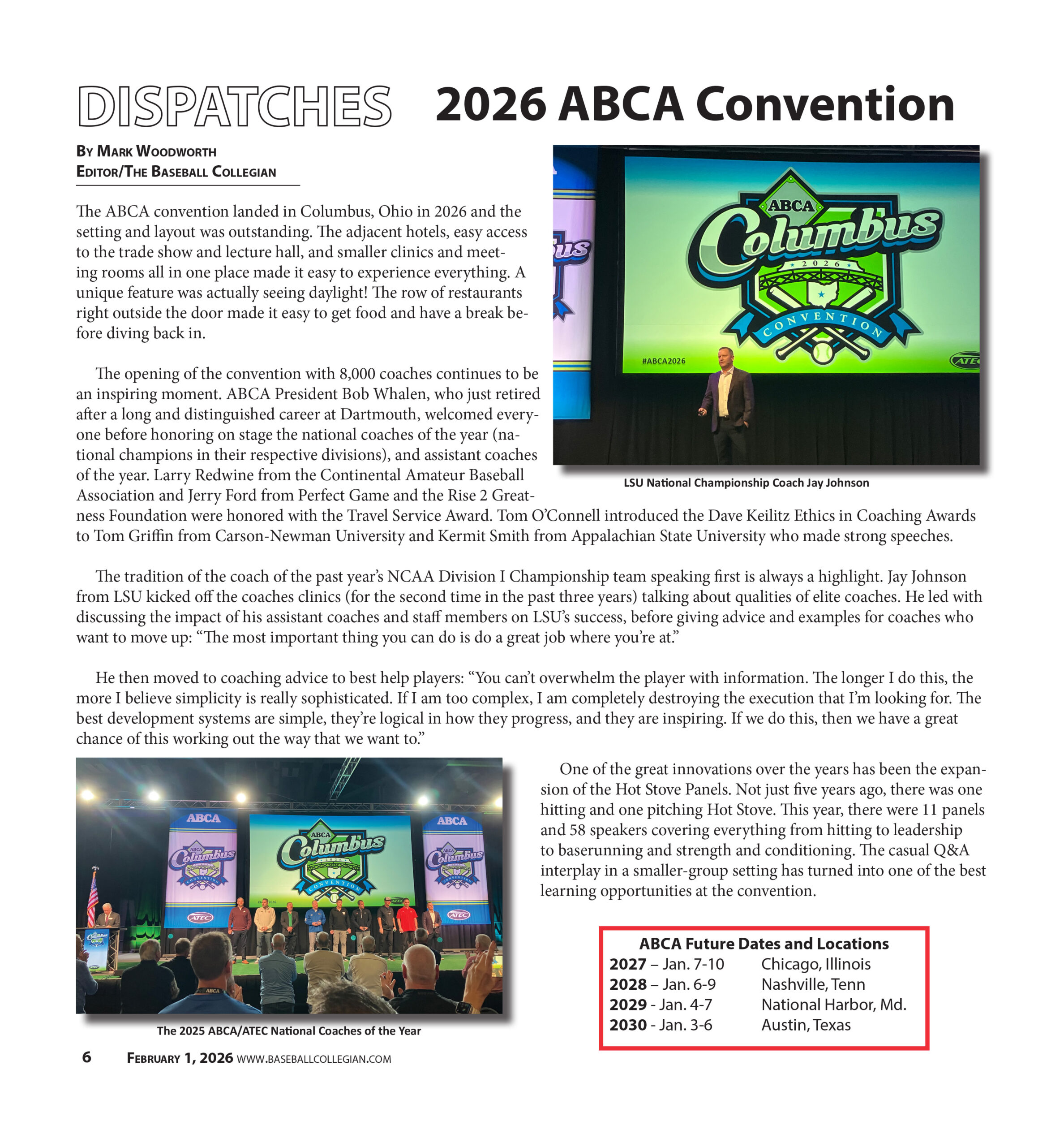The opening of the convention with 8,000 coaches continues to be an inspiring moment. ABCA President Bob Whalen, who just retired after a long and distinguished career at Dartmouth, welcomed everyone before honoring on stage the national coaches of the year (national champions in their respective divisions), and assistant coaches of the year. Larry Redwine from the Continental Amateur Baseball Association and Jerry Ford from Perfect Game and the Rise 2 Greatness Foundation were honored with the Travel Service Award. Tom O’Connell introduced the Dave Keilitz Ethics in Coaching Awards to Tom Griffin from Carson-Newman University and Kermit Smith from Appalachian State University who made strong speeches.