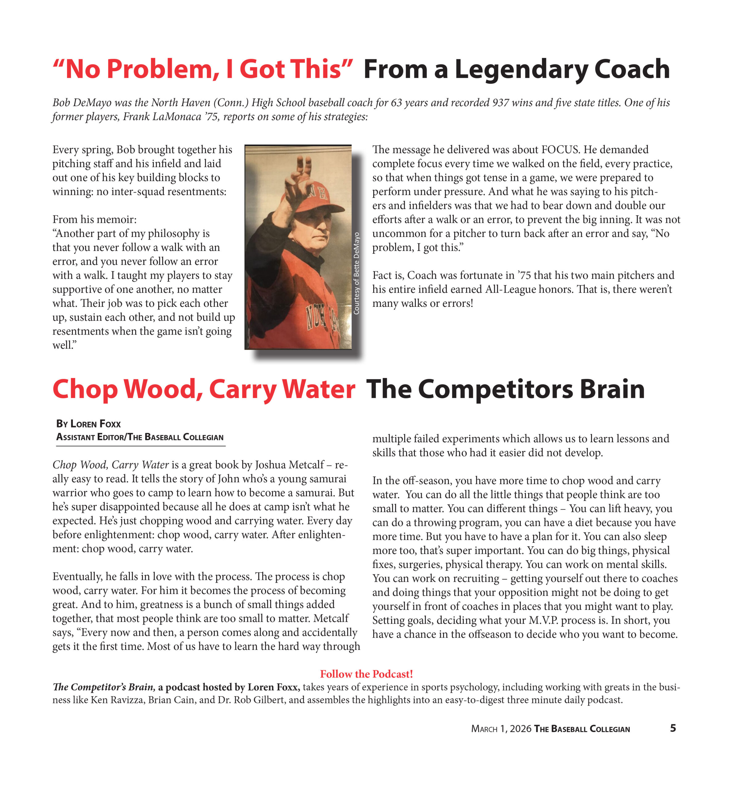 Bob DeMayo was the North Haven (Conn.) High School baseball coach for 63 years and recorded 937 wins and five state titles. One of his former players, Frank LaMonaca ‘75, reports on some of his strategies: