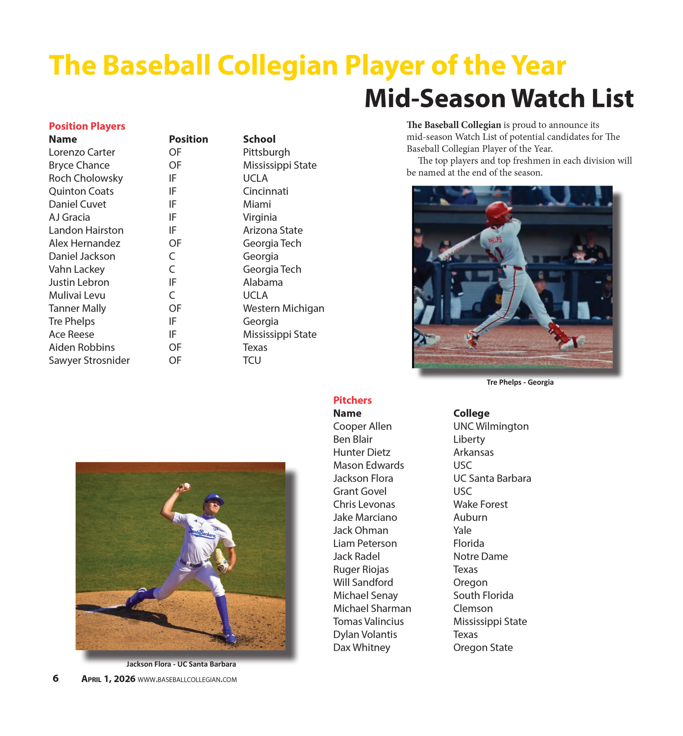 The Baseball Collegian is proud to announce its mid-season Watch List of potential candidates for The Baseball Collegian Player of the Year.