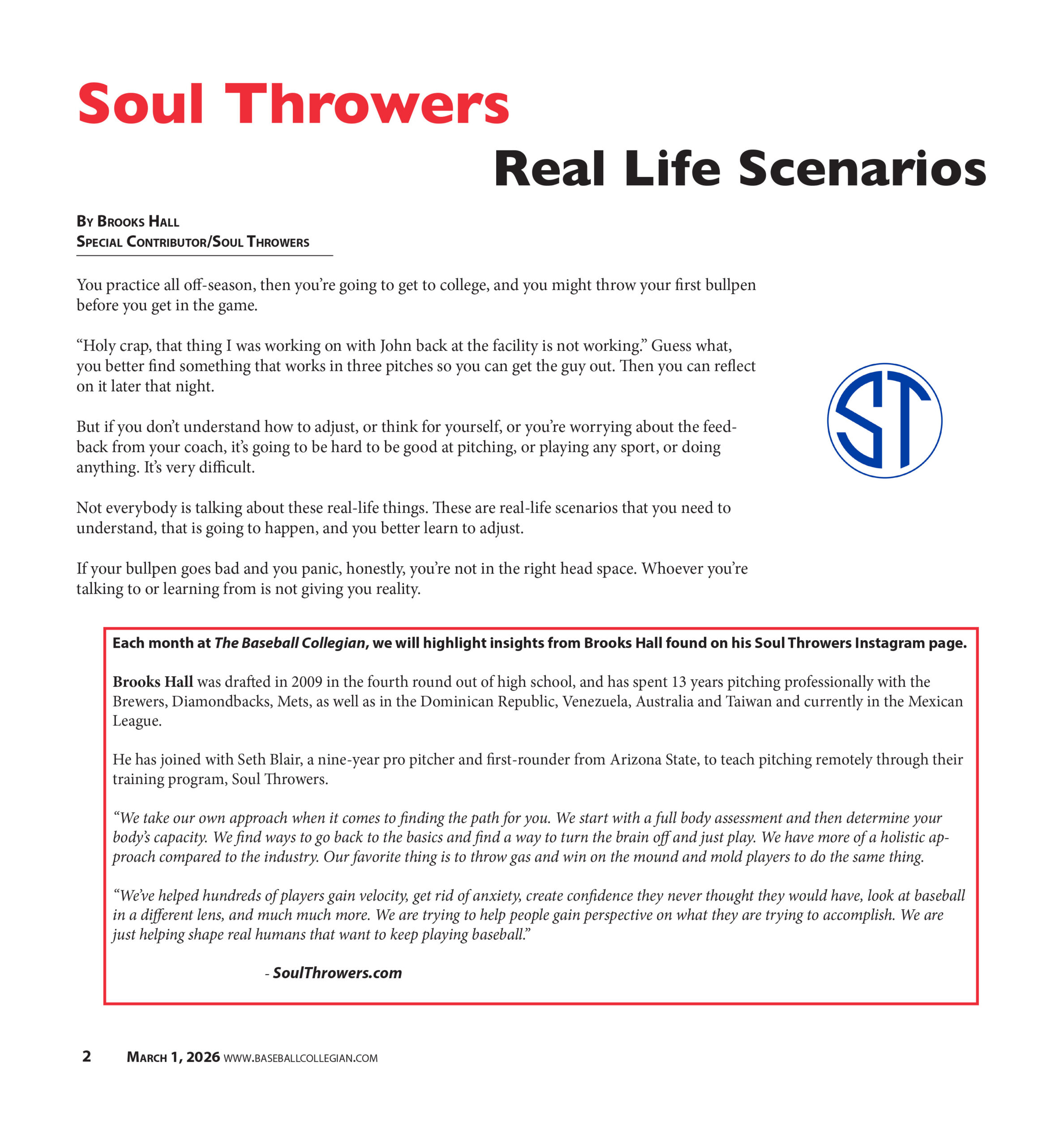 Each month at The Baseball Collegian, we will highlight insights from Brooks Hall that can be found on his Soul Throwers Instagram page.