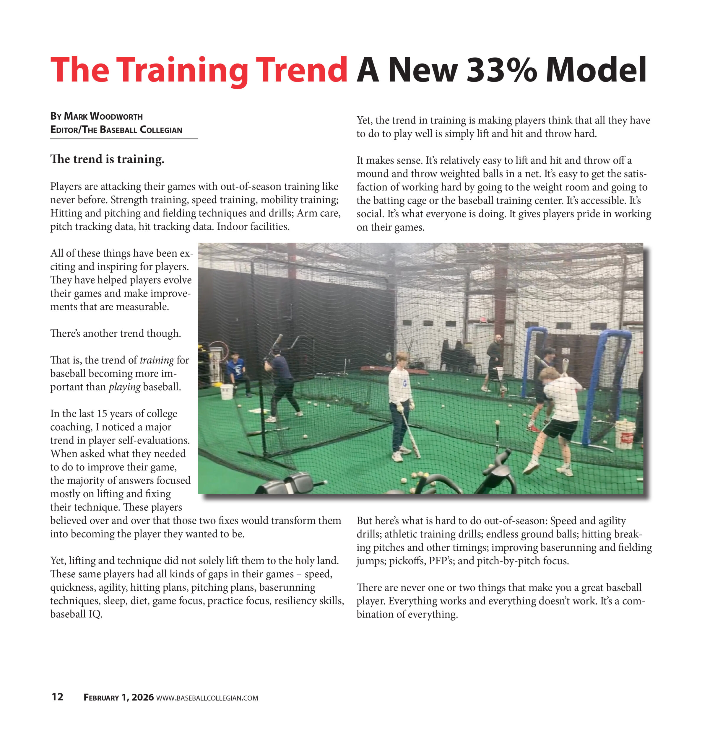 Players are attacking their games with out-of-season training like never before. Strength training, speed training, mobility training; Hitting and pitching and fielding techniques and drills; Arm care, pitch tracking data, hit tracking data. Indoor facilities.