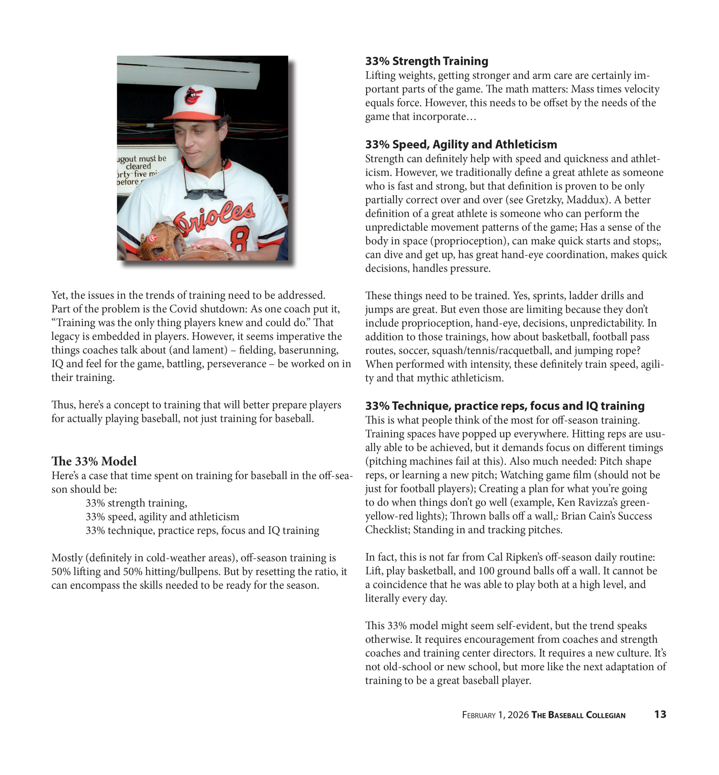 This 33% model might seem self-evident, but the trend speaks otherwise. It requires encouragement from coaches and strength coaches and training center directors. It requires a new culture. It’s not old-school or new school, but more like the next adaptation of training to be a great baseball player.
